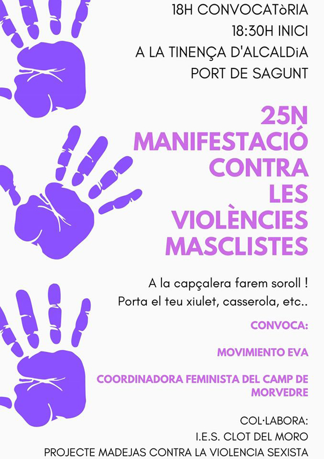 Un dia abans, dilluns, 25 de novembre, tindrà lloc la tradicional manifestació que, davall el lema ’25 N Manifestació contra les violències masclistes’, començarà a les 18.30 hores des de la Tinència d’Alcaldia del Port de Sagunt. Està convocada per Movimiento Eva i la Coordinadora Feminista del Camp de Morvedre, amb la col·laboració de l’IES Clot del Moro i el Projecte Madejas contra la violència masclista.