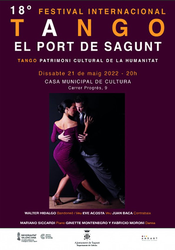 Un any més, el XVIII Festival Internacional de Tango arriba al Port de Sagunt. Esta 18a edició, organitzada pel departament de Cultura de l'Ajuntament de Sagunt, comptarà amb la presència d'artistes com Walter Hidalgo (bandoneó i veu), Eve Acosta (veu), Juan Baca (contrabaix), Mariano Siccardi (piano), Ginette Montenegro i Fabricio Moroni (dansa).